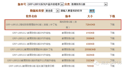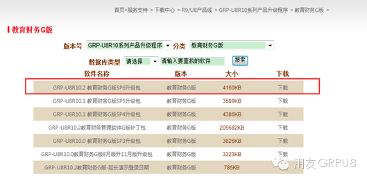 升级包来源:用友政务网站(http://www.yonyougov.com )—服务支持—下载中心-GRP-U8R10系列产品升级程序—教育财务G版