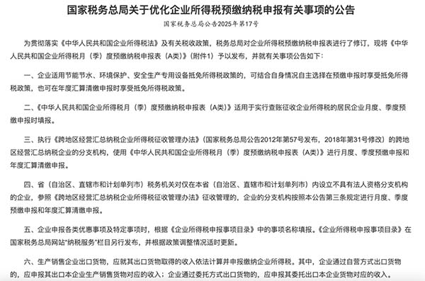 近期,国家税务总局发布的《关于优化企业所得税预缴纳税申报有关事项的公告》(国家税务总局公告 2025 年第 17 号),则为小微企业带来了诸多利好。