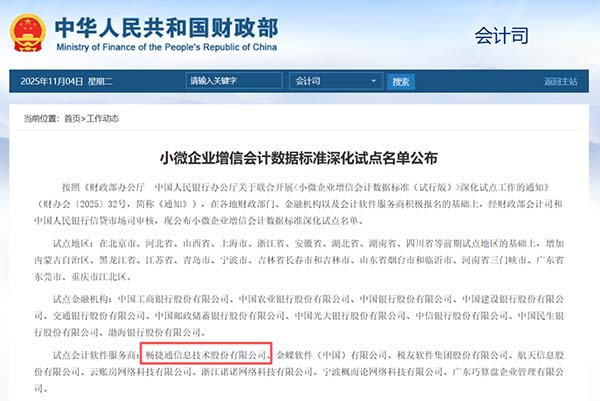 近日,据石家庄用友了解,财政部正式公布了《小微企业增信会计数据标准深化试点名单》,旨在通过统一会计数据标准,发挥会计数据要素的价值,助力小微企业拓宽融资渠道。畅捷通成功入选“试点会计软件服务商”,标志着在小微企业财税数智化服务领域的数据技术能力、与数据要素应用实践成果获得财政部会计司、人民银行信贷市场司的认可。