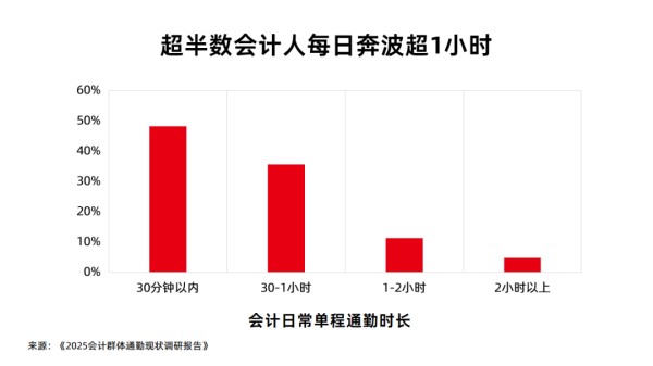 通勤不仅消耗时间,更直接影响工作状态。62% 的会计人认为“通勤时间越长,工作效率越低”,到岗后需要额外时间“回血”才能投入工作。