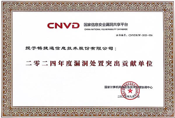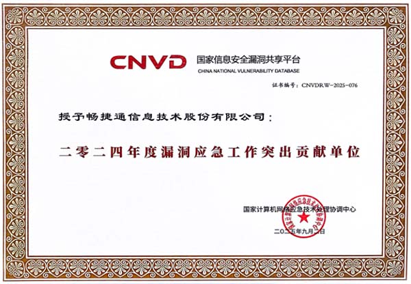 凭借成熟的安全管理体系和规范化的安全运营能力,用友畅捷通荣获“CNVD漏洞处置突出贡献单位” 与 “CNVD漏洞应急工作突出贡献单位” 两项国家级荣誉。这不仅是对畅捷通在网络安全领域专业能力的权威认可,也体现了在保障客户数据安全、筑牢数智防线方面的持续投入与扎实成果。