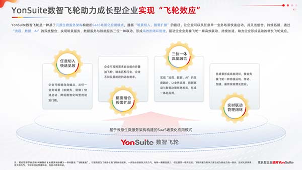 用友YonSuite创新提出的数智飞轮3.0场景化应用方案,正是为解决这一困境而生。这是一种基于云原生微服务架构构建的SaaS创新应用模式,遵循场景切入,随需扩展的路径,让企业可以从任意单一业务场景快速启动,并灵活组合、持续拓展,通过“流程×数据×AI”的深度融合,实现场景服务、数据服务与智能服务三位一体联动,形成高效的闭环管理,驱动企业业务像飞轮一样高效联动、持续加速,助力企业形成强劲的增长飞轮效应。