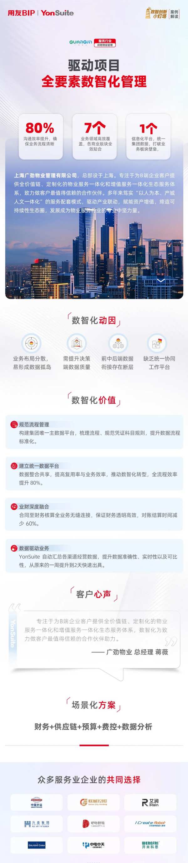 上海广劲物业管理有限公司财务总蒋薇说:“我们一直专注给 B 端企业客户,打造全流程、定制化的物业服务和增值服务生态。这次和用友 YonSuite 合作搞数智化,就是想成为客户最靠谱的伙伴。” 从蒋薇这番话能看出来,广劲物业下定决心,要用数智化升级物业服务。事实证明,这次转型特别成功,不仅解决了数据不通、流程卡壳的老问题,还搭建起一套完整的项目数智化管理体系,给以后提升服务、拓展业务打下了坚实基础。