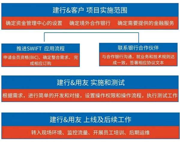 1.需求确认阶段(建设银行 + 客户):确定企业资金管理中心的组织架构与功能设置、筛选并确定境外合作银行、明确企业所需的金融服务清单;同步推进 SWIFT 应用流程,包括申请 SWIFT 会员资格(获取 BIC 代码)、确认系统整合需求、完成相关服务订购。