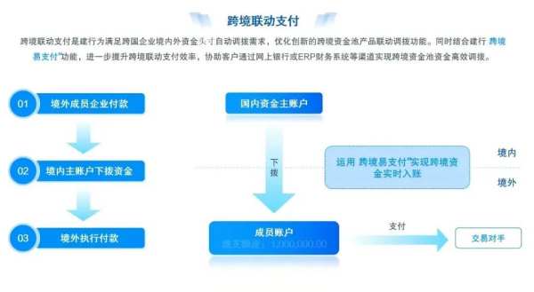 针对跨国企业 “境内外资金头寸自动调配” 的核心需求,建设银行在跨境资金池基础上,优化创新跨境联动支付功能;同时整合 “建设银行跨境易支付” 服务,进一步提升支付效率 —— 企业可通过网上银行或 ERP 财务系统,直接发起跨境资金池内的资金调拨,无需线下提交材料,操作便捷且实时到账。