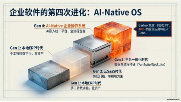 第三代是平台一体化时代(用友BIP/YonSuite、NetSuite等),将多场景整合到统一平台,打通数据与流程,服务成长型企业。